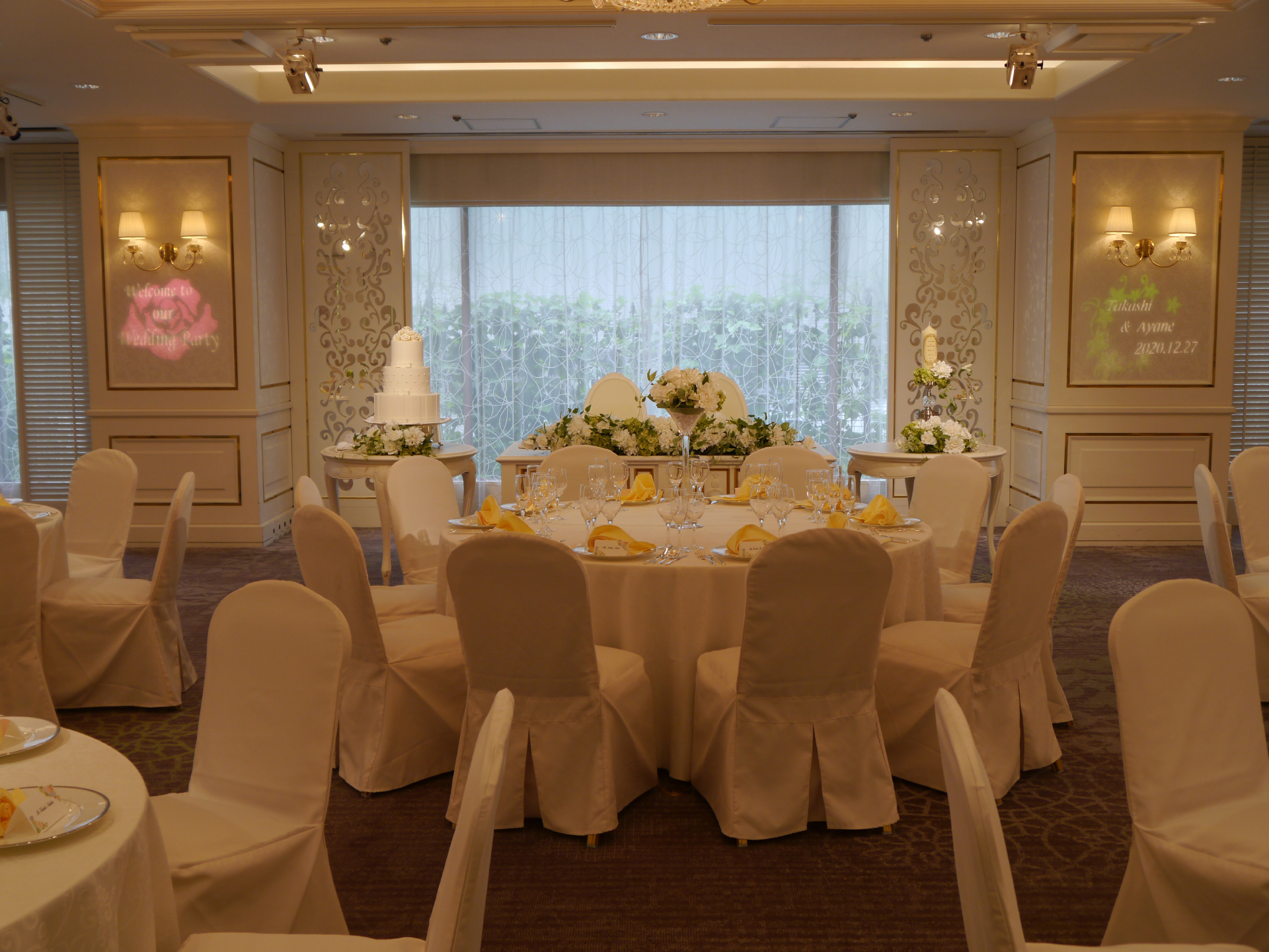 お2人のお名前・ご披露宴の日付やウェディングシーンに合わせた光の文字を投影いたします。